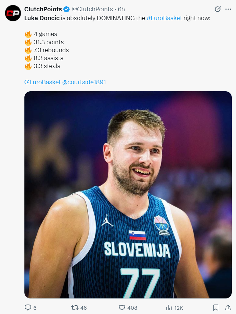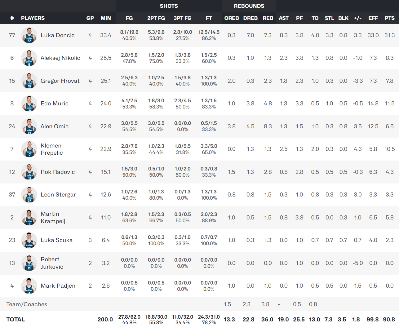 斯洛文尼亚全队场均90.8分,东契奇一人占比34.47%,全队只有三人场均得分上双,普雷佩里奇场均10.5分,穆里奇场均11.5分,这个局面比他在湖人队还要惨很多,在湖人队至少还有两个场均20+的队友,詹姆斯场均24+,里夫斯场均 20+。